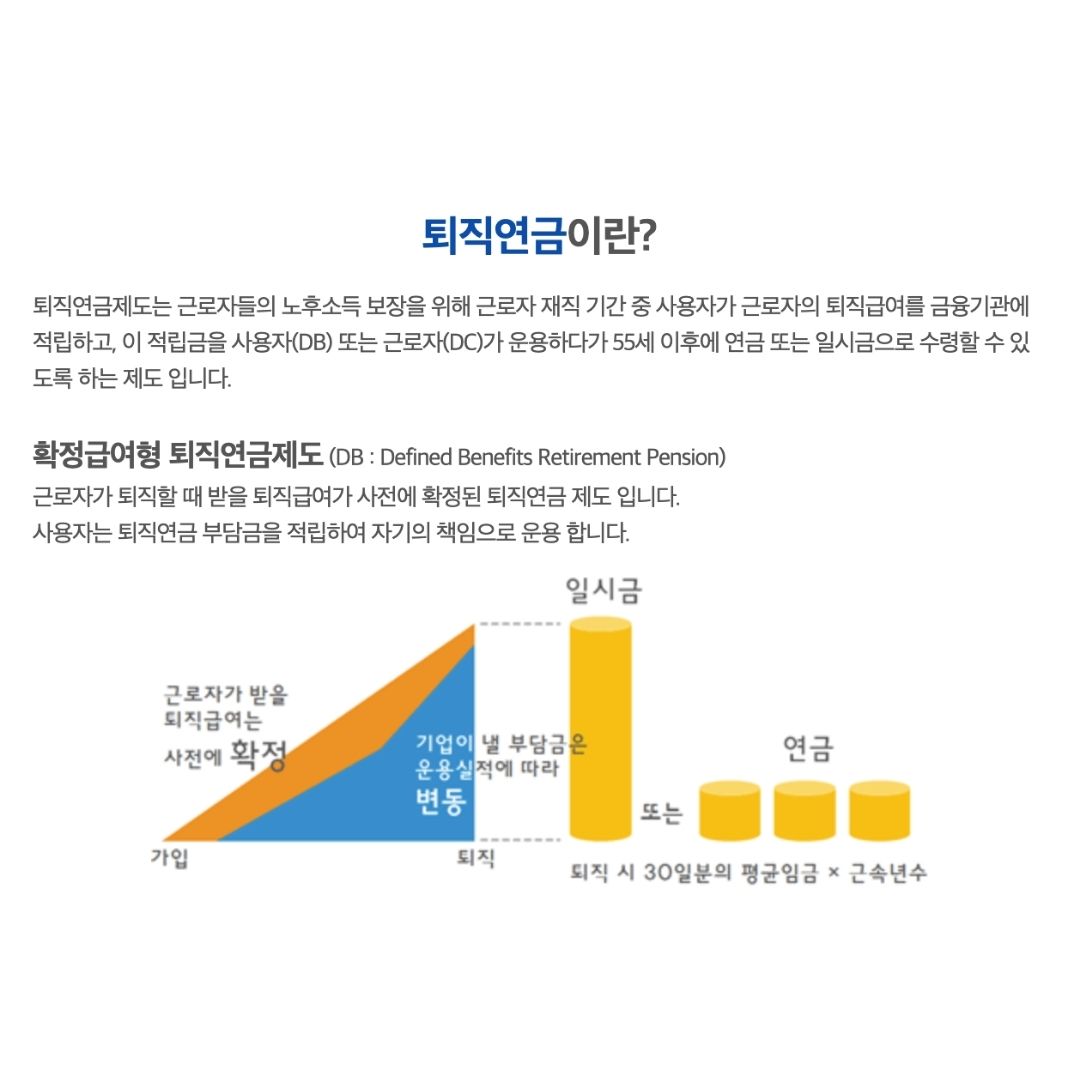 퇴직금은 말 그대로 퇴직을 할 때 받게 되어 있는 돈입니다. 기업은 1년 이상 근속한 근로자가 주당 15시간 이상 근무를 하면 지급하게 되어있습니다. 하지만 기업이 부도가 나거나 자금사정이 어렵다는 이유로 지급을 하지 못하는 경우가 종종 발생하기도 합니다. 그래서 2005년에는 퇴직연금제도가 생기게 된 것입니다.