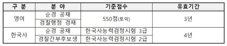일반 공무원 시험과 마찬가지로 경찰공무원 채용 시험도 영어, 한국사 검정제가 실시되게 되었습니다. 이에 따라 영어 시험의 경우에는 토플, 텝스, 지텔프, 플렉스, 토셀도 인정이 되며 영어 시험 유효기간 3년, 한국사 유효기간 4년으로 바뀌었습니다.
