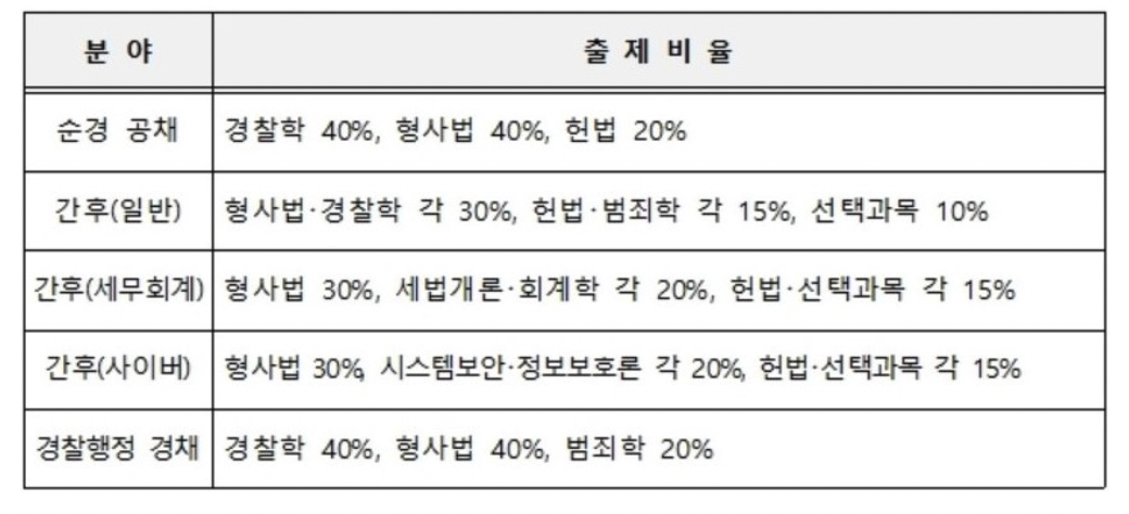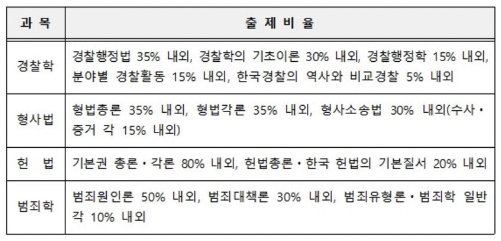 그리고 과목 내에서도 출제비율이 이전과 다소 달라졌으니 이 점도 꼭 확인하시어 경찰공무원 채용시험 준비에 참고하시기 바랍니다.